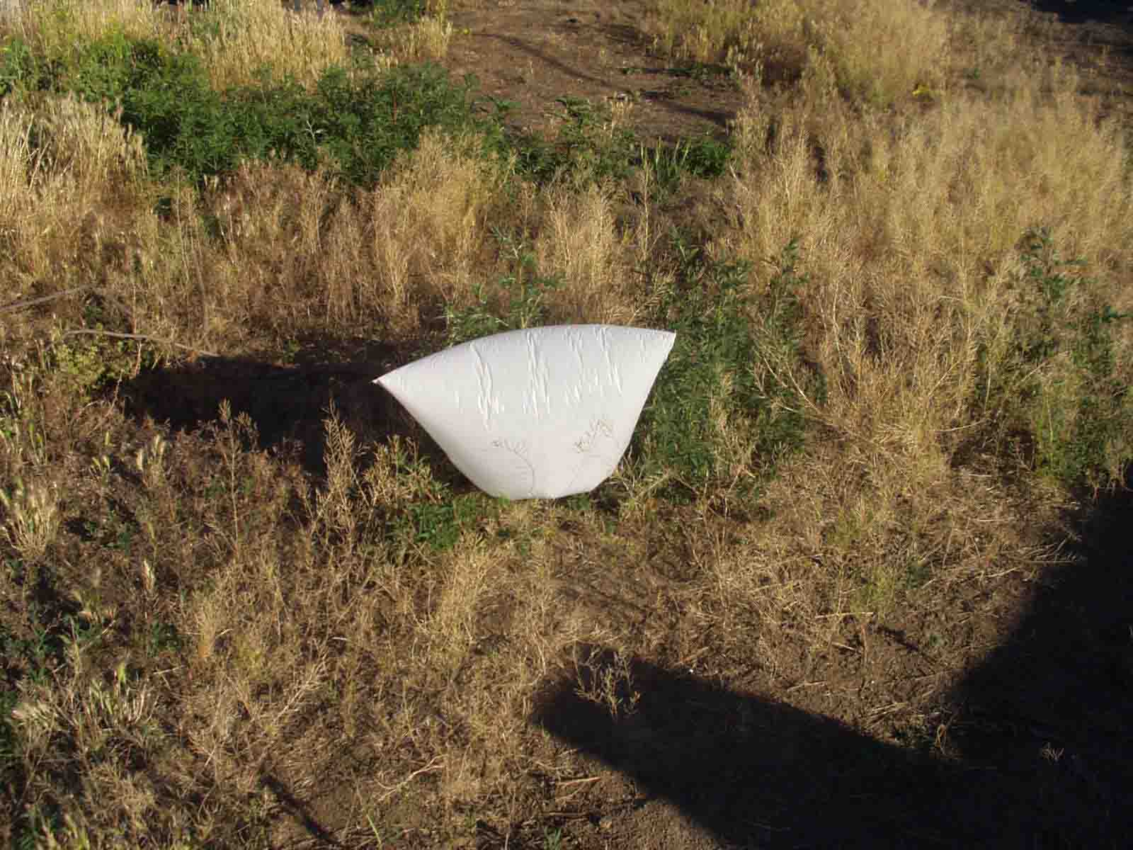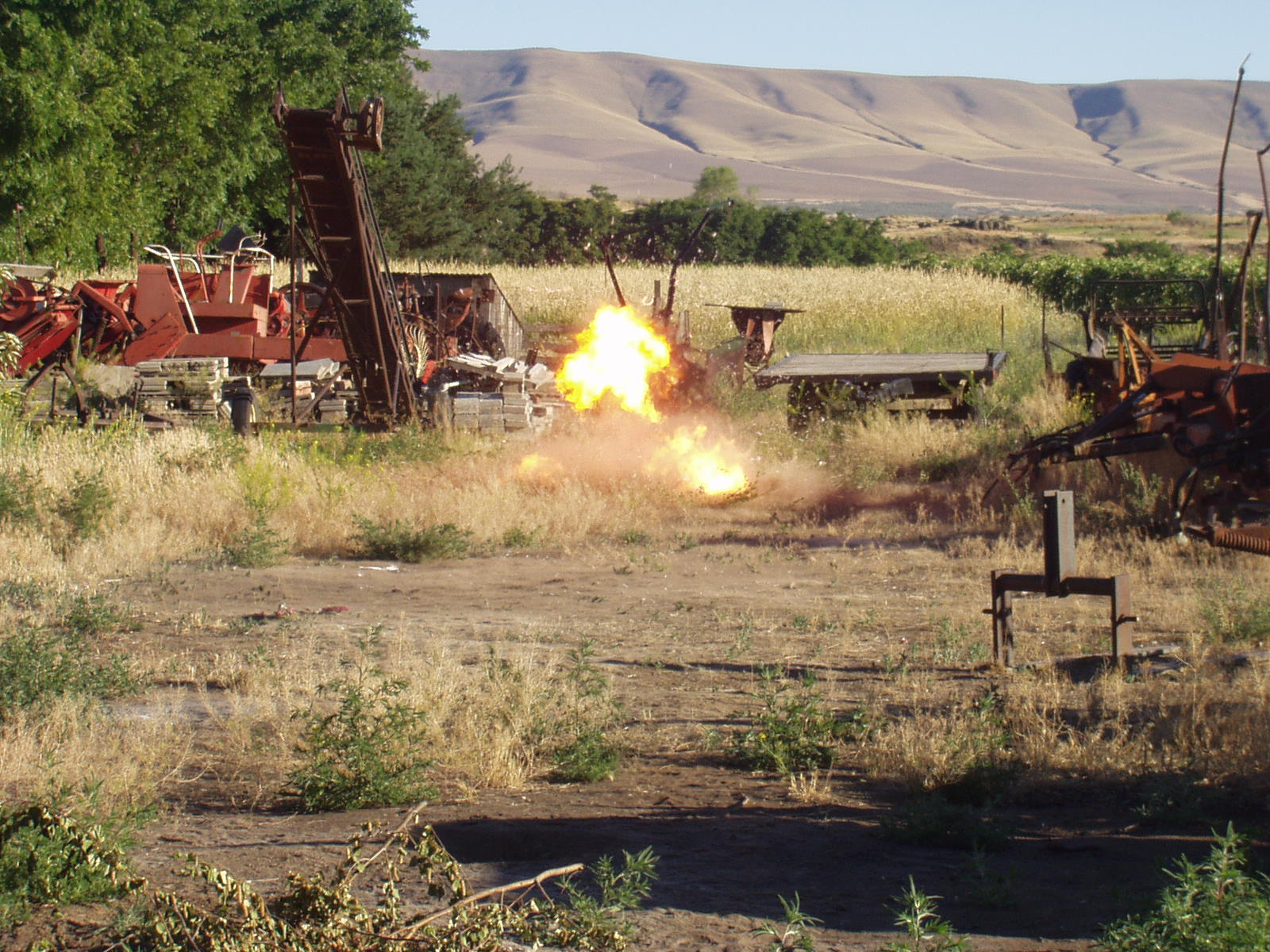 It was just a small 13 gallon bag half filled but it had an impressive punch to it, I would say it rivaled a 1/2 pint boomer. It rattled the windows so much that after a few shots, I was asked not to do it any more. :-) It also emitted a bright flash which I was able to capture it with my digital camera in the third picture. The video was taken with the same camera also (it was before I had a DV camera) so there is no audio. My digital camera takes QuickTime files so I converted them to MPEG and then to WMV so the quality is poor.
